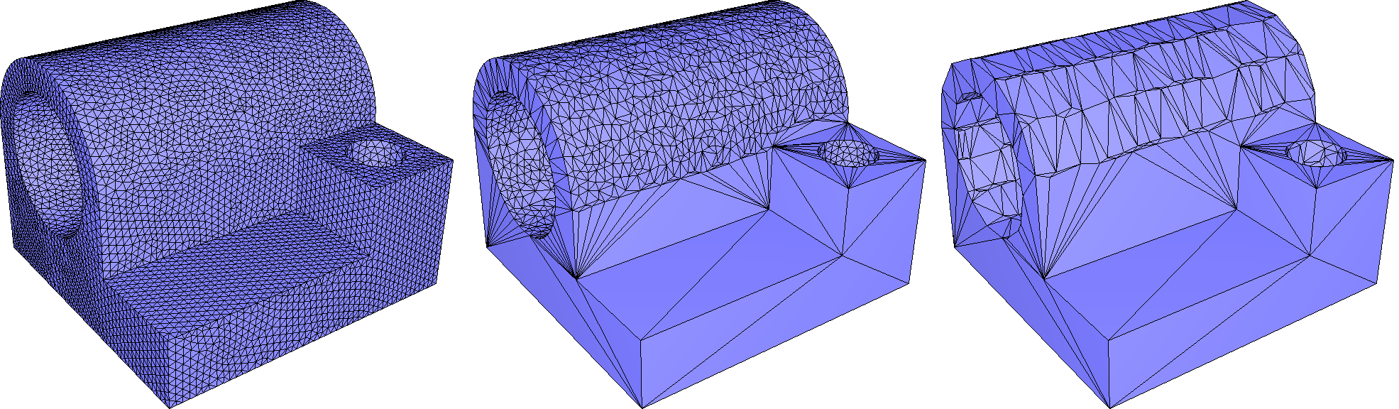 A triangulated region of a polygon mesh can be remeshed using the function CGAL::Polygon_mesh_processing::isotropic_remeshing(), as illustrated by Figure 77.2. The algorithm has two parameters: the sizing field object for the remeshed surface patch, and the number of iterations of the abovementioned sequence of operations.