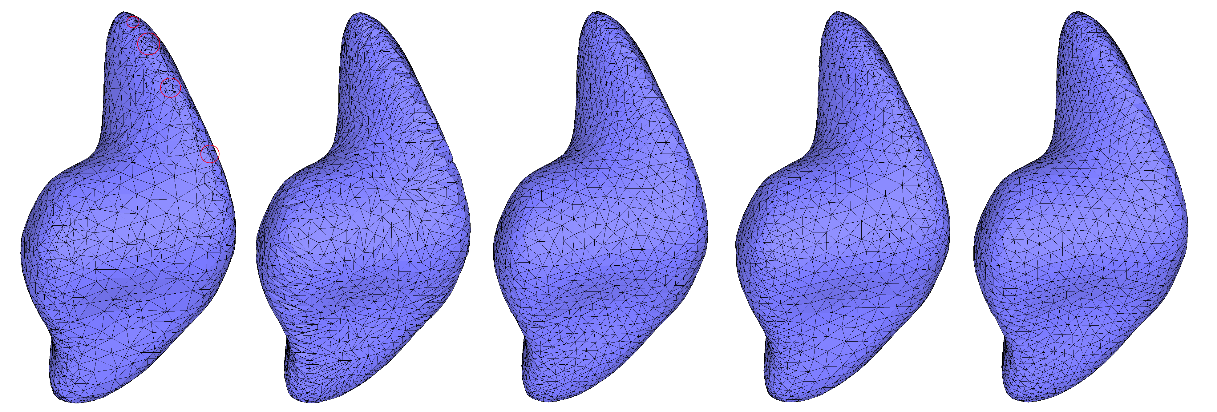 The incremental triangle-based isotropic remeshing algorithm introduced by Botsch et al [2], [4] is implemented in this package. This algorithm incrementally performs simple operations such as edge splits, edge collapses, edge flips, and Laplacian smoothing. All the vertices of the remeshed patch are reprojected to the original surface to maintain a good approximation of the input.