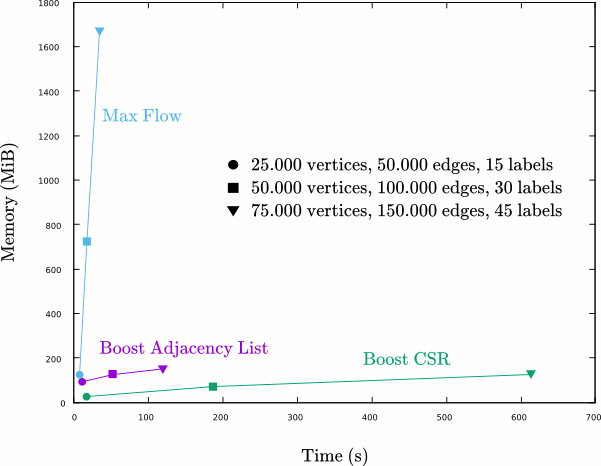 CGAL::Alpha_expansion_boost_adjacency_list_tag (default)CGAL::Alpha_expansion_boost_compressed_sparse_raw_tagCGAL::Alpha_expansion_MaxFlow_tag, released under GPL license and provided by the Triangulated Surface Mesh Segmentation packageAll these implementations produce the exact same result but behave differently in terms of timing and memory (see Figure 114.4). The MaxFlow implementation is the fastest, but it grows rapidly in memory when increasing the complexity of the input graph and labeling; the compressed sparse raw (CSR) is very efficient from a memory point of view but becomes very slow as the complexity of the input graph and labeling increases; the adjacency list version provides a good compromise and is therefore the default implementation.
