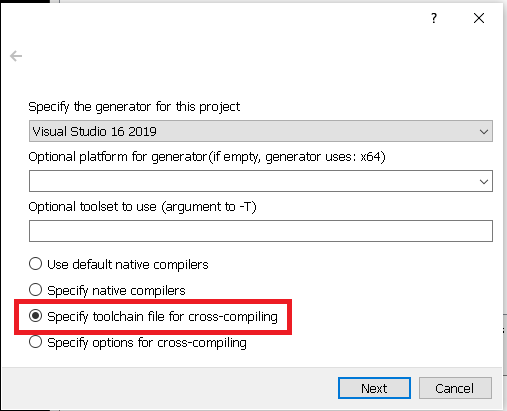 x64 in case you want to create 64 bit binaries), vcpkg.cmake within the directory where you have installed vcpkg, e.g. C:/dev/vcpkg/scripts/buildsystems/vcpkg.cmake).