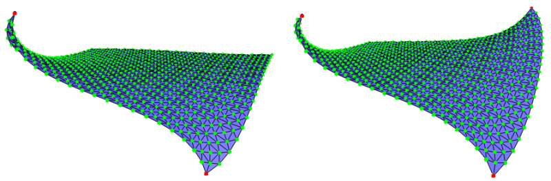 If the mesh connectivity must be preserved, the Spokes and Rims deformation technique is guaranteed to always correctly minimize the energy even if the weights are negative. However, this technique is more dependent on the discretization of the deformed surface (See Figure 82.2).
