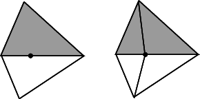 Insertion of a point is done by locating a face that contains the point, and then splitting this face. If the point falls outside the convex hull, the triangulation is restored by flips. Apart from the location, insertion takes a time time \(O(1)\). This bound is only an amortized bound for points located outside the convex hull.