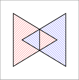 Figure 40.2 (a) Two triangles in \( {\mathbb R}^3\), as given in envelope_triangles.cpp. (b) Their lower envelope. (c) Their upper envelope.