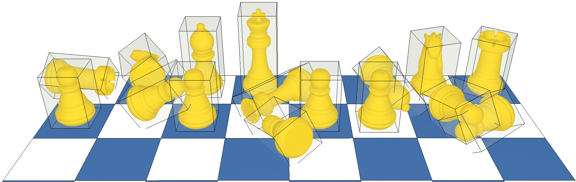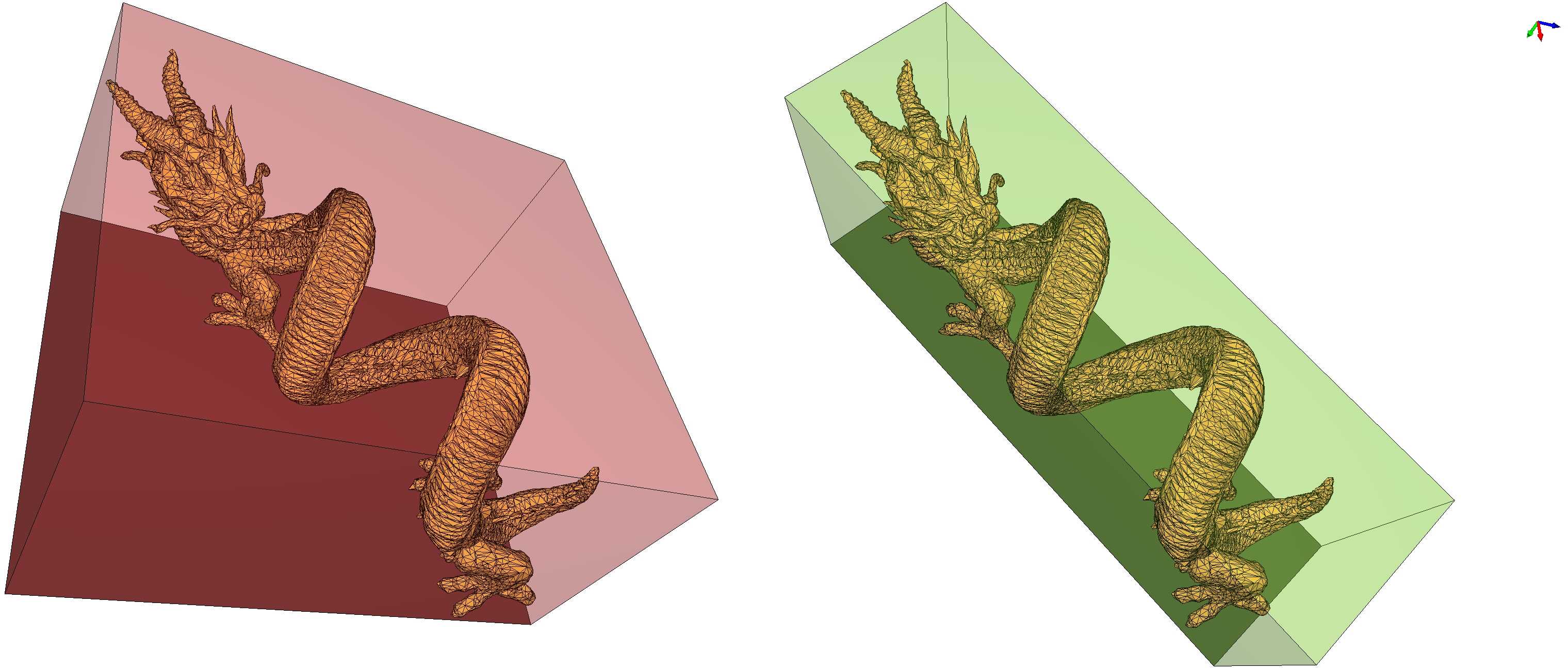 Encompassing a model within a volume is a common approach to accelerate a number of applications such as collision detection or visibility testing: the proxy volume provides a rapid way to test a configuration or filter results, with the real model only being used when required. Typical coarser volumes that can be used to approximate a more complex model are simplified meshes (for example using the package Triangulated Surface Mesh Simplification), convex hulls, or simple rectangular boxes. Within this last category, the axis-aligned bounding box (AABB) has obvious advantages: it is extremely simple to compute and one may build a hierarchical structure of successively tighter volumes to further speed up intersection and distance computations. One such example of structure is the CGAL AABB tree (2D and 3D Fast Intersection and Distance Computation). The disadvantage is also clear: the box is usually poorly fitting most models. A good compromise between the good approximation offered by convex hulls or simplified meshes and the speed offered by axis-aligned bounding boxes are Optimal Bounding Boxes. Contrary to the AABB, the optimal bounding box of a model is not necessarily axis-aligned, but provides a tight approximation.