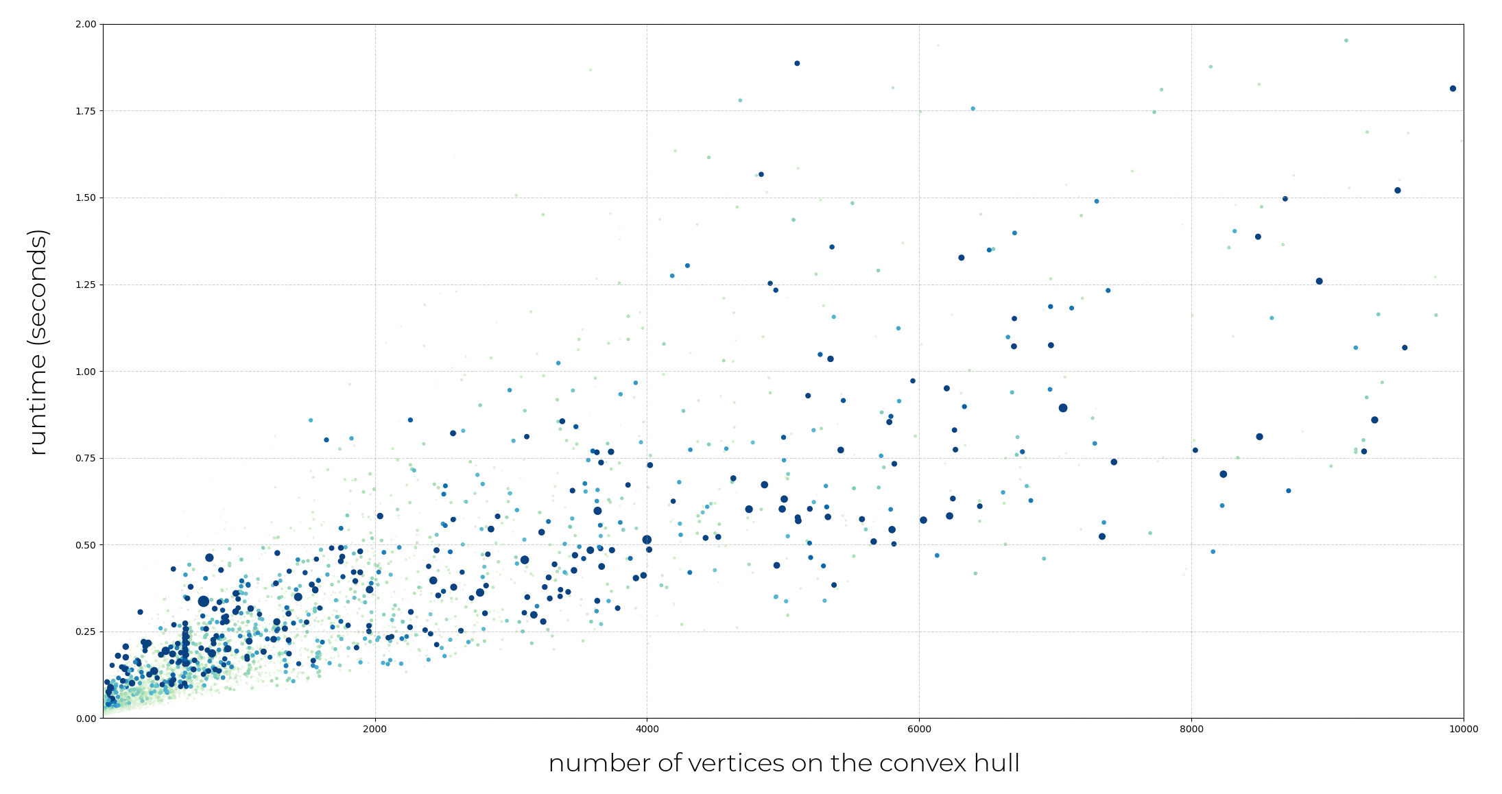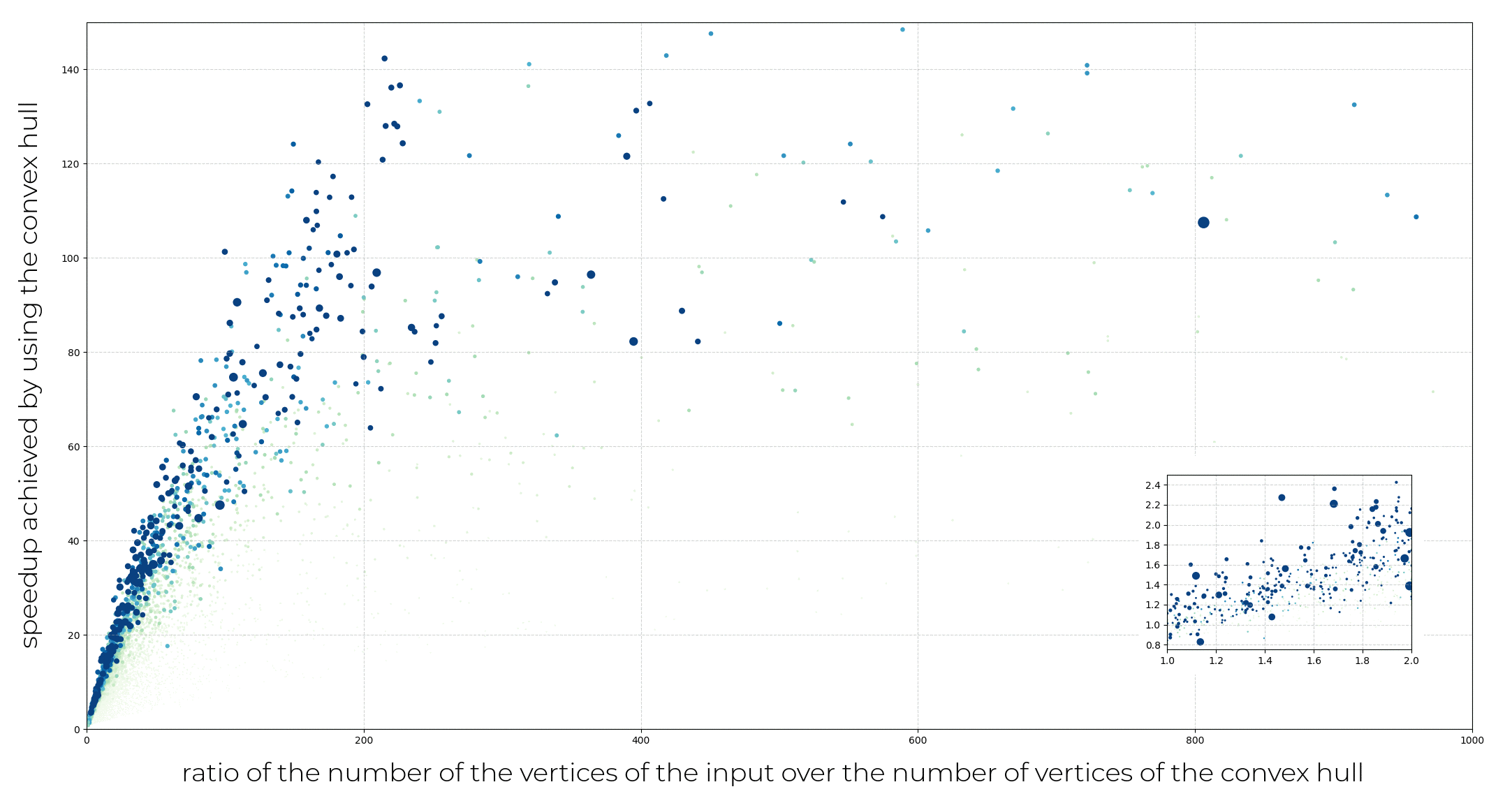 Figure 110.3 Computation of the speedup achieved on the total runtime of the algorithm when the convex hull is computed and used afterwards. Note that the total runtime includes the construction of the convex hull (when it is used). The color and size of the dots represent the number of vertices in the input data (larger, bluer points having more input vertices than greener, smaller points). Computing the convex hull is beneficial for all but a handful of cases.