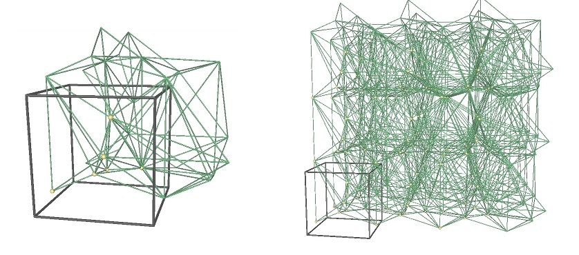 Figure 51.3 The same periodic triangulation in the 1-sheeted covering space and the 27-sheeted covering space.