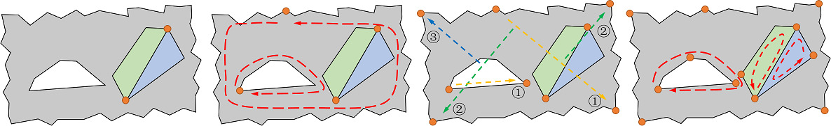 Figure 87.8 Adding anchors. From left to right: starting from a partition (grey) with a hole (white) and two encircled regions (green and blue), we add a starting anchor (orange disk) to the boundary cycle (red dash line) without any anchor (2nd), subdivide the circular chord (3rd, the number indicates the level of recursion) and add anchors to the boundary cycle with less than 2 anchors (4th, red dash lines).