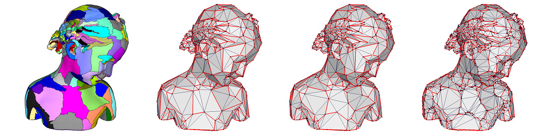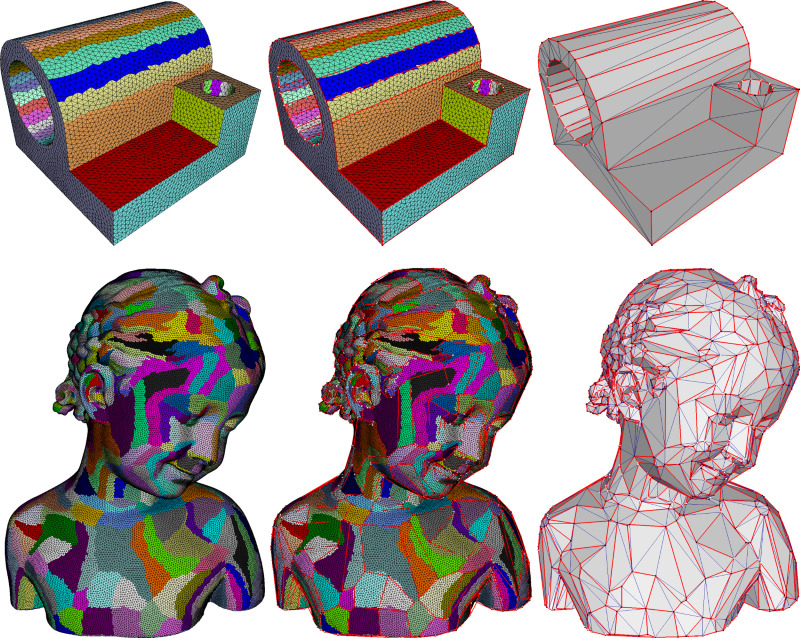 Figure 87.1 Variational shape approximation on two models with the \( \mathcal{L}^{2,1} \) error metric and planar proxies. From left to right: partition of the input surface triangle mesh, anchor vertices and edges, and output triangle mesh. The partition is optimized via discrete clustering of the input triangles, so as to minimize the approximation error from the clusters to the planar proxies (not shown).