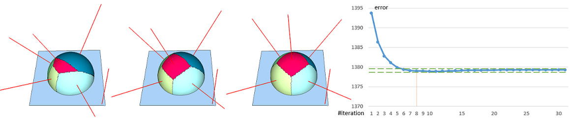 Figure 87.5 Using different number of proxies to approximate the plane-sphere model. From left to right: 8, 14, 20 proxies. We plot right the error against the number of proxies.