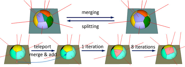 Figure 87.6 Operations on the sphere-cube union model. Upper row: merging (9 proxies) and the reverse bisection splitting (10 partitions) on the confined region. Lower row: one teleportation operation of merging and adding a face seed, the sphere is approximated with one more proxy.