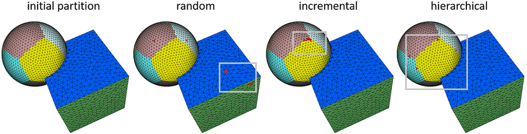 Figure 87.4 Different seeding methods on the sphere-cube model. From left to right: initial partition ( \( \mathcal{L}^{2,1} \) metrics and 20 proxies), add 5 proxy seeds (red faces) with random, incremental and hierarchical methods respectively.