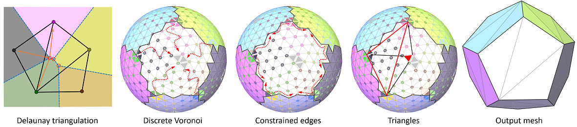 The first image of Figure 87.9 depicts how the Delaunay triangulation of set of points (colored disks) is deduced from its dual Voronoi diagram (colored regions separated by blue lines) by connecting the points indicated by the vertices (red circles) where 3 Voronoi cells meet. In an analogous manner, we construct discrete Voronoi cells from which the triangulation is extracted.