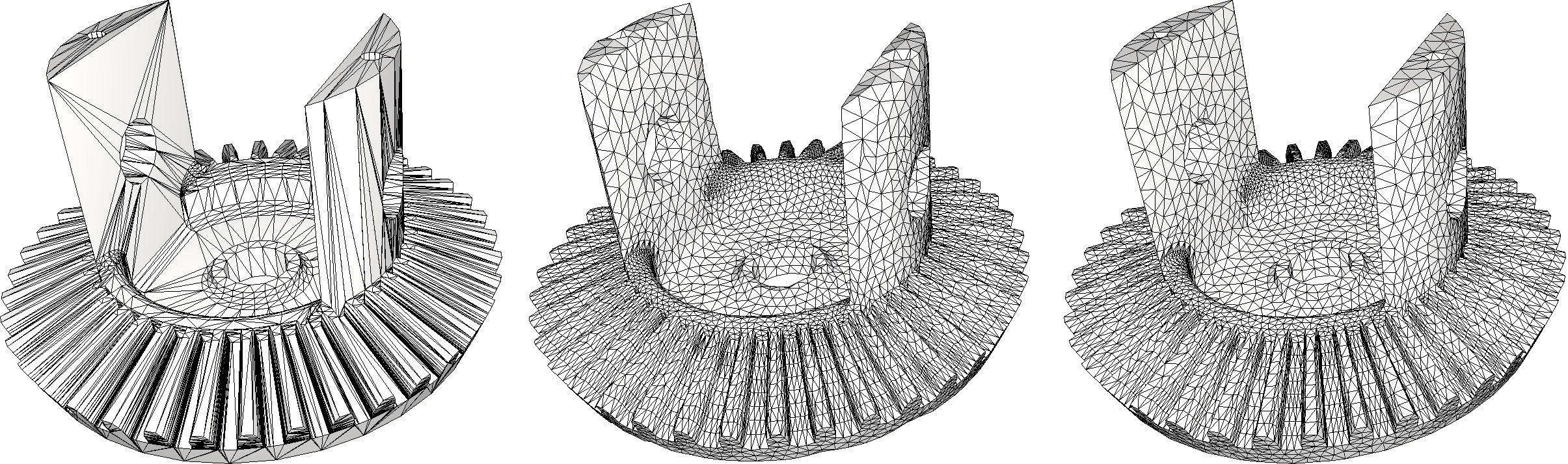 - CGAL::Polygon_mesh_processing::isotropic_remeshing(), which uses atomic operations such as edge splits, edge collapses, edge flips, and Laplacian smoothing to adapt a mesh to a user-provided sizing field.
