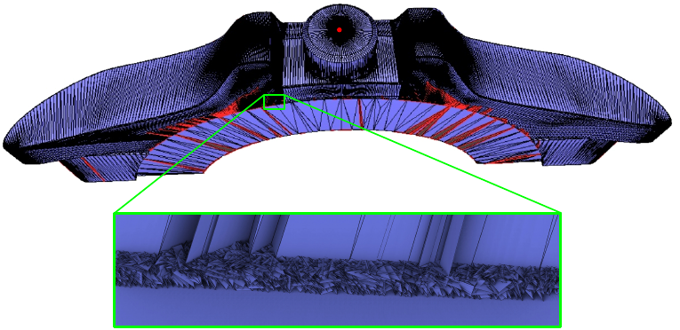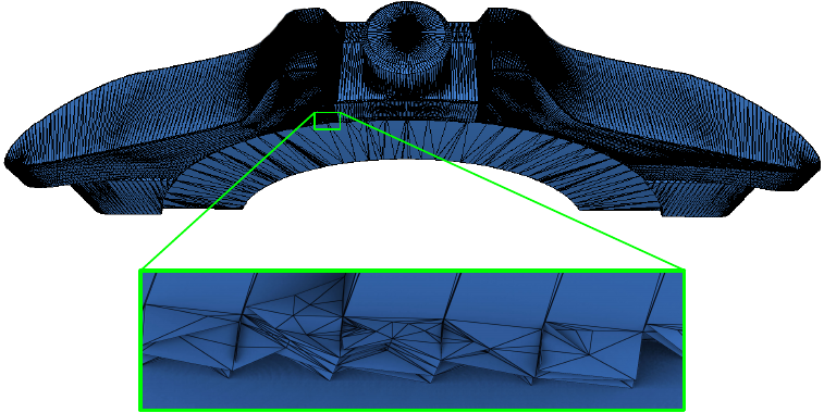 The second part of our solution is a novel snap rounding strategy: based on the work of Lazard and Valque [1], the main idea behind the method is a loop that rounds vertex coordinates of triangles involved in self-intersections to integers (up to a scaling factor), eliminates degenerate elements, and resolves self-intersections again, until all self-intersections are resolved or a user-defined maximum number of iterations is reached. Even if there is no theoretical guarantee for successful termination, it performs well in practice: using the default values of the parameters for this method, all the models but one could be rounded with one call. The single remaining model, the infamous model 996816 (see image at the top of the post) required a few more iterations.