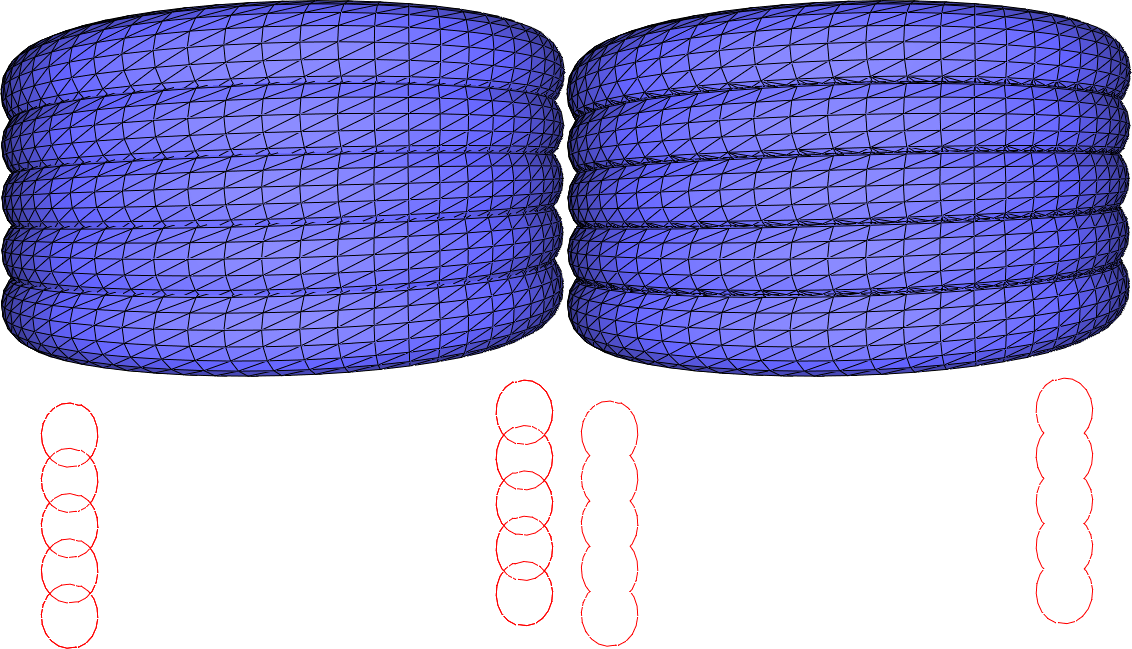 Left: A triangle mesh generated by sweeping a circle along a spiral curve; Right: A triangle mesh free from self-intersection bounding the same volume as in the left picture; On the bottom, we see the intersection curve of a plane with the triangle meshes.