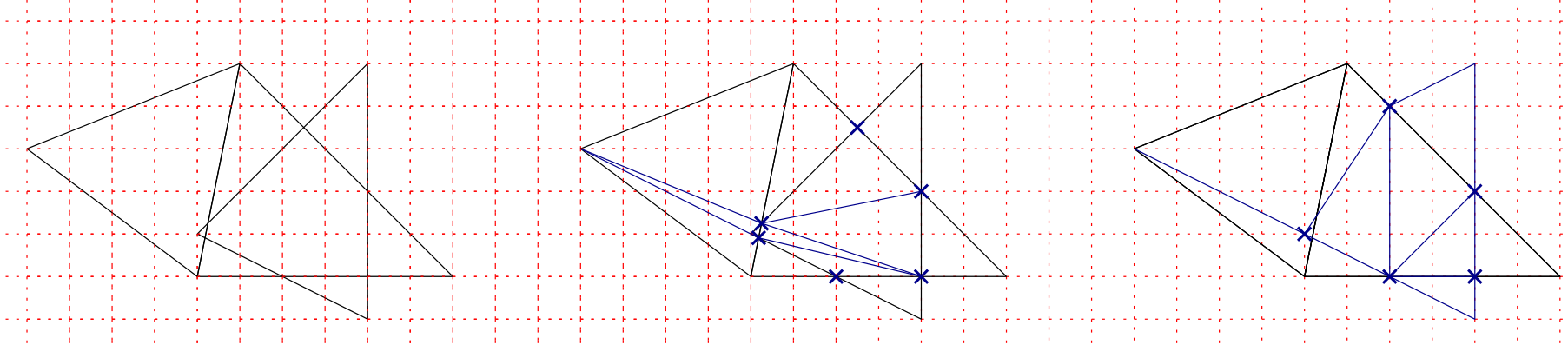 Illustration of rounding issues in self-intersection resolutions. The red grid represent the grid of floating point numbers. Points with floating points coordinates must lie on a vertex of the grid. From left to right: input triangles with floating point numbers coordinates; Resolution of intersections of triangles using arbitrary precision; Rounding new intersection points to the nearest vertex on the grid: even if the intersection is solved with arbitrary precision, the rounding using floating point coordinates induces new intersections that cannot be solved by naively iterating the process (in addition to creating new degenerate faces).