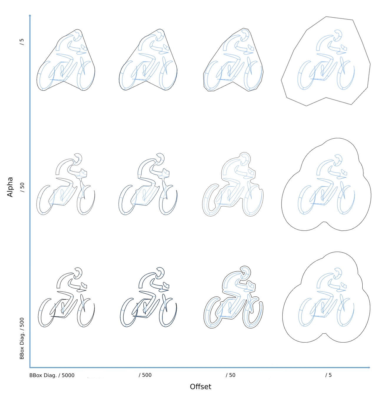 Two parameters control the behavior of our algorithm: alpha and offset. The parameter alpha controls the minimum carving size, and thus the size of straits and holes that cannot be traversed during carving. The parameter \delta is the value of the distance field level-set defining the offset surface. It controls the distance of the mesh vertices to the input, and thus the tightness of the approximation (see Figure below). Both parameters can be chosen independently and arbitrarily large or small, but must be strictly positive.